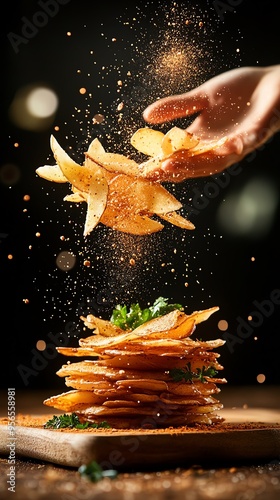 Rhineland Reibekuchen potato pancakes, stacked and served with apple sauce, on a wooden board with a rustic backdrop
