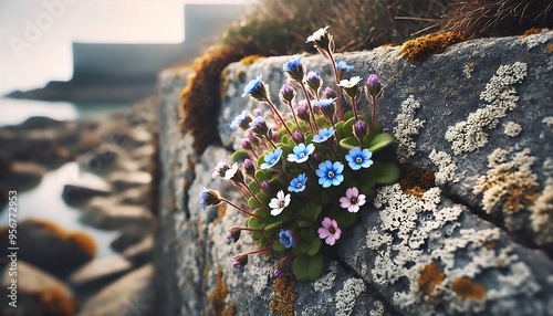 Blue and Pink Wildflowers Growing on Lichen-Covered Coastal Stone Wall