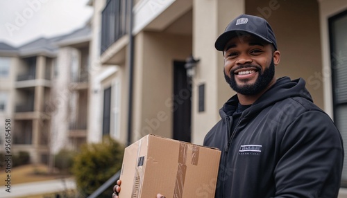 A dedicated delivery worker holds a package with confidence while standing outdoors, embodying the spirit of the delivery job.
