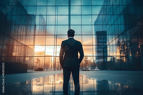 A man stands in front of a modern glass business center. Back view.