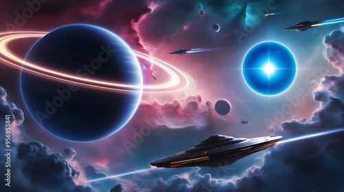 planeta oraz jej slonce i latajace statki