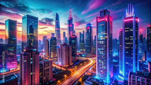 Vibrant neon lights illuminate a cityscape at dusk, blending futuristic skyscrapers with abstract shapes, capturing the essence of working hard and playing hard.