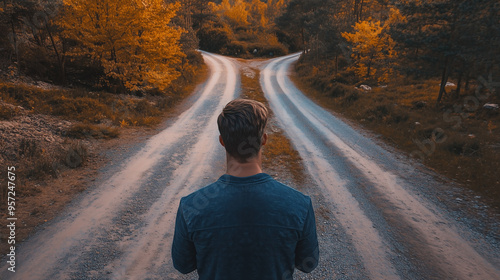 Mężczyzna wybiera między dwiema drogami, biorąc pod uwagę ich wpływ na ochronę środowiska.