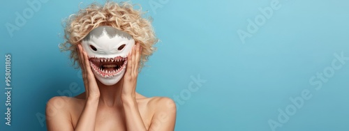 A woman in blonde locks wears a white mask, its edges adorned with a chilling grin, shielding her face With her hands, she conceals it from view