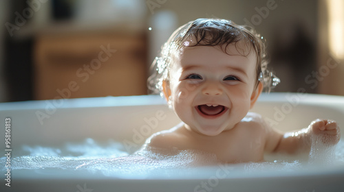 Niemowlę śmieje się głośno podczas kąpieli w wannie, zanurzone w miękkiej pianie i bąbelkach.