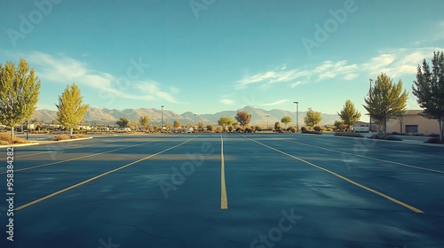 A wide-open parking lot under a clear blue sky, framed by distant mountains and lush trees, evoking emptiness and tranquility.