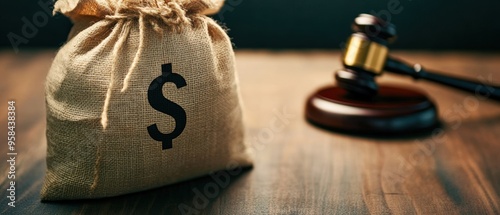 Money bag with a judge s gavel in the background, symbolizing financial penalties and fines for criminal offenses, emphasizing the legal ramifications