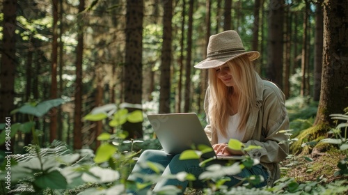 Nature work environment with a woman using a laptop in a serene forest clearing 1