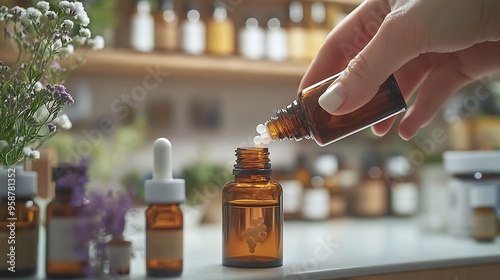 A practitioner preparing a homeopathic remedy by carefully diluting a tincture into a small vial, with shelves filled with natural supplements, herbal extracts, and wellness products in the