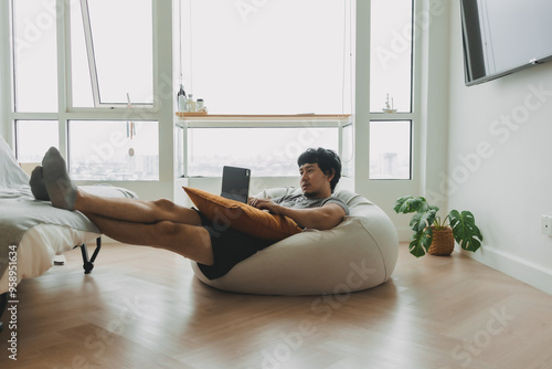#958951634Asian man working with his laptop lying on the bean bag sofa in living room.