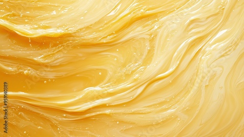 a yellow liquid with water droplets on both its surface and the water's surface is presented in a close-up