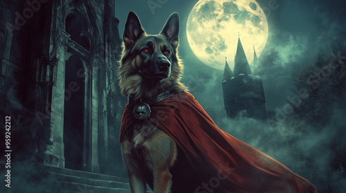 dog in a red cape with a gothic castle background under a full moon