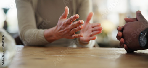 Hands, couple and angry in home, table and argument of people, fighting with accusation and drama. House, calm and miscommunication in relationship, conflict and fight in marriage, divorce or emotion