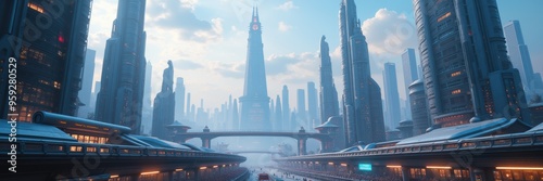 A futuristic cityscape featuring towering skyscrapers and advanced transportation, perfect for themes of innovation, technology, and urban development.