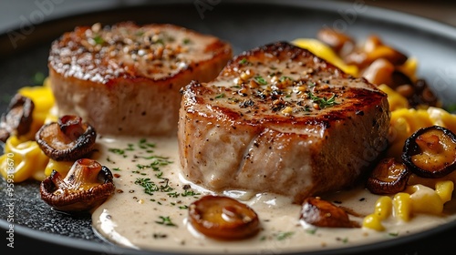 Modern style traditional barbecue pork filet medaillons in cream sauce with chanterelle mushrooms and spaetzle offered as closeup on a Nordic design plate : Generative AI