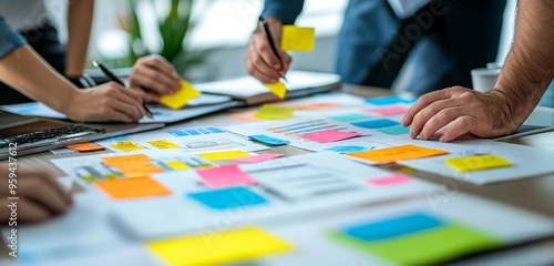 Closeup of a table covered in colorful sticky notes, papers, and a pen, used for brainstorming or planning a project.