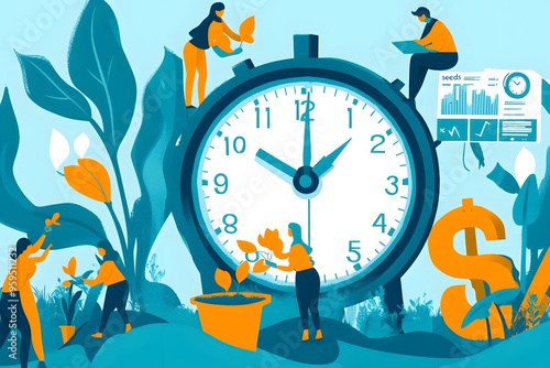 People Planting Seeds Around a Giant Clock and Dollar Sign