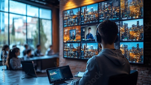Virtual classroom setup students and teacher engaged through video conferencing with educational tools displayed on screens
