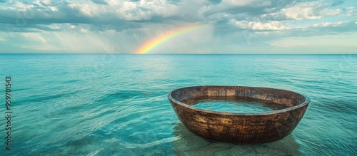 Wooden baptismal font placed before the turquoise waters of Lake Huron The idea that Christ is the cornerstone of the Church and cleanses us of our sins in Holy baptism A faint rainbow appears across