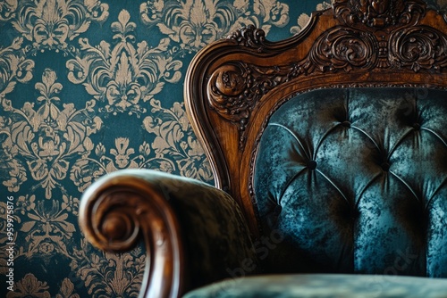 Close-up of an ornate vintage armchair with carved wooden details and luxurious fabric upholstery against a richly patterned wallpaper, embodying classic elegance and heritage decor