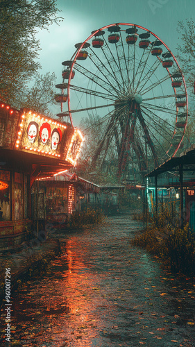 Una espeluznante feria abandonada por la noche, con atracciones oxidadas, una noria parpadeante y espeluznantes caras de payasos en carteles descoloridos. La escena está iluminada por luces tenues
