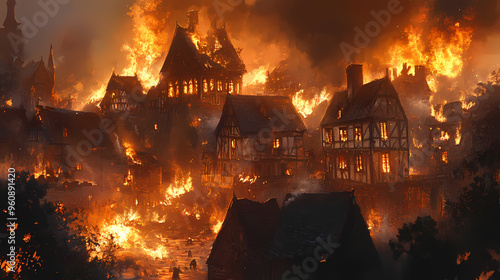 Fantasy tudor medieval village burning concept art. Medieval Village. Illustration