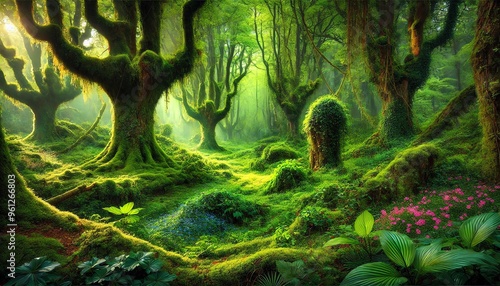 A magical and enchanting scene of a lush, green forest. The environment is vibrant, with even denser vines, ivy, and moss covering the trees and ground