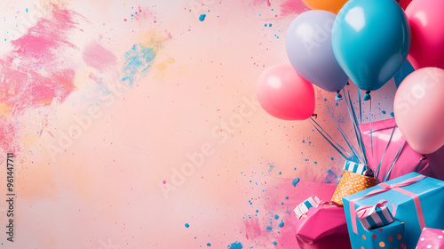 Wizualizacja urodzinowa dla dziecka, na której kolorowe balony i piękne prezenty tworzą przyjazny i radosny wygląd.