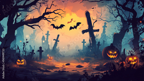 Przerażająca sceneria Halloweenowa w nawiedzonym lesie, gdzie cmentarz otoczony jest złowieszczo wyglądającymi drzewami i latającymi nietoperzami.