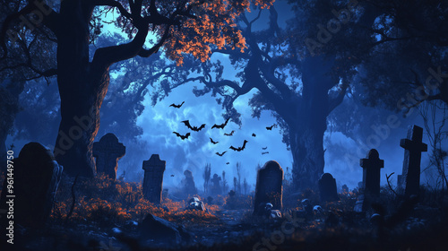 Przerażająca sceneria Halloweenowa w nawiedzonym lesie, gdzie cmentarz otoczony jest złowieszczo wyglądającymi drzewami i latającymi nietoperzami.