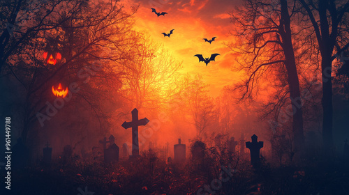 Przerażająca sceneria Halloweenowa w nawiedzonym lesie, gdzie cmentarz otoczony jest złowieszczo wyglądającymi drzewami i latającymi nietoperzami.