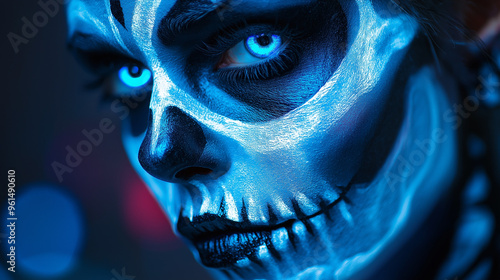 Day of The Dead. Halloween. Close-up portrait of a devilish handsome woman with skull makeup on a dark background. Dia de los muertos.