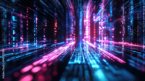 Neon lights in a 3D abstract scene, illuminating a dark environment, representing modern technology and the energy of digital innovation.