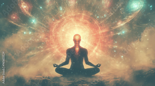 Postać siedząca w medytacji, z promieniującą energią wokół ciała, symbolizującą otwieranie wyższych stanów świadomości.