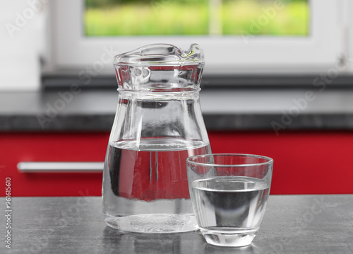 Woda źródlana w szklanym dzbanku i szklance, izolowana w kuchni