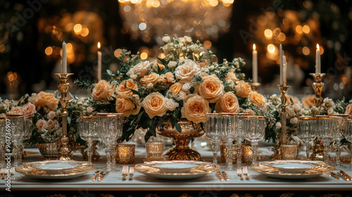 A buffet setup with elegant table decor, fine dining utensils, and chandeliers, highlighting sophistication.
