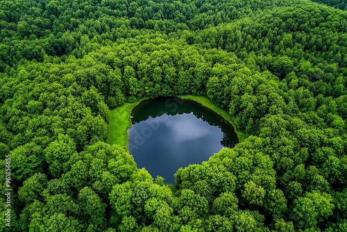 Aerial view, forest clearing, hidden secrets reveals a small meadow or lake, secluded within the dense woods