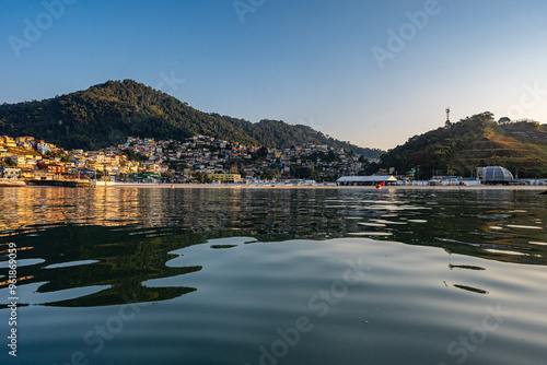 Praia do Anil em Angra dos Reis vista do mar ao amanhecer, com os morros e montanhas ao fundo.