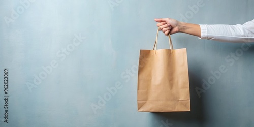 Hand Holding Brown Paper Bag Against Blue Background, Paper Bag, Shopping, Retail