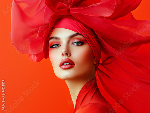 Piękna młoda kobieta w czerwieni i makijażu.