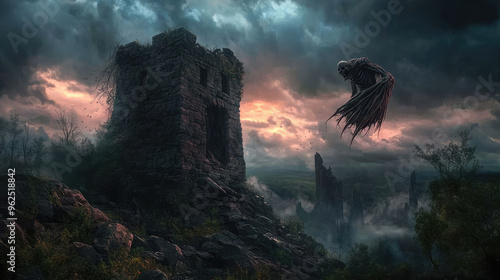 A castle is shown in the sky with a ghostly figure flying above it