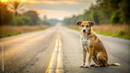 Stray dog sitting on a deserted road , lonely, abandoned, homeless, animal, pet, mammal, street, pavement, urban, stray, pavement