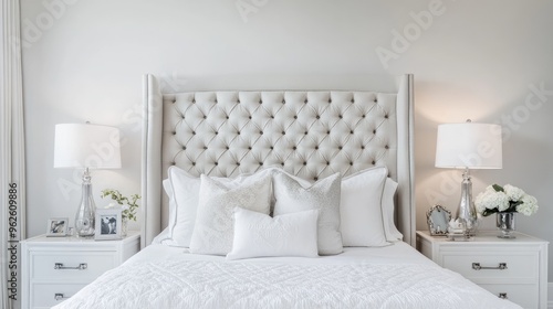 Luxurious white master bedroom with a tufted headboard, crisp white linens, and modern bedside tables.