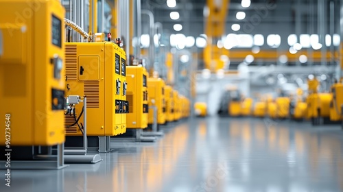 Factory interior featuring standby diesel generators, yellow industrial equipment in a clean, organized power backup room