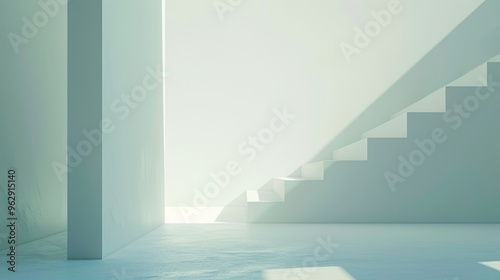 A pristine, minimalist white stairway illuminated by soft, natural light creates an airy, serene atmosphere.