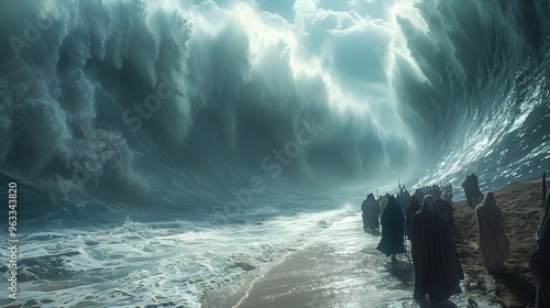 Visualize the powerful scene where Moses raises his staff, causing the Red Sea to split and form massive walls of water, as the Israelites walk across the dry seabed,