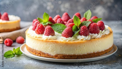 Creamy basque cheesecake topped with fluffy whipped cream and fresh raspberries