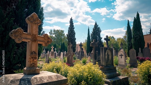 Madrid, Spain; 6th June 2021: Crosses in the foreground and tombstones in the background of the old cemetery of San Isidro in Madrid, Spain. generative ai