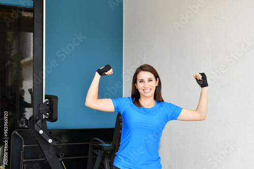 Mujer latina bonita mostrando sus brazos luego de un entrenamiento de fuerza con pesas. Toma horizontal.
