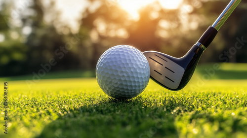 Piłka golfowa ustawiona na tee z kijem golfowym znajdującym się obok, co wskazuje na gotowość do rozpoczęcia uderzenia.